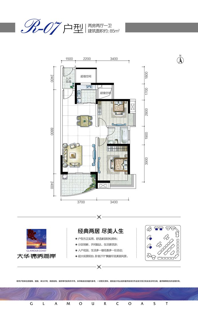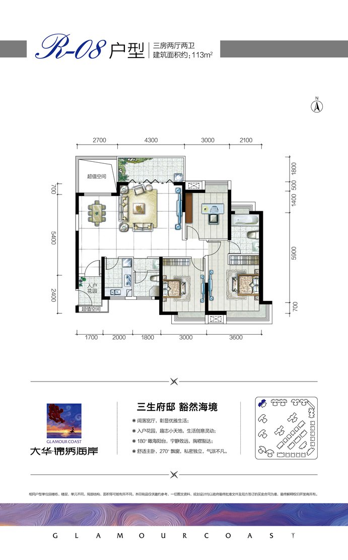 大华锦绣海岸项目一期总占地面积为56336㎡;总建筑面积约117513㎡,容积率为1.75,绿化率为40%,共1044户,987个车位。